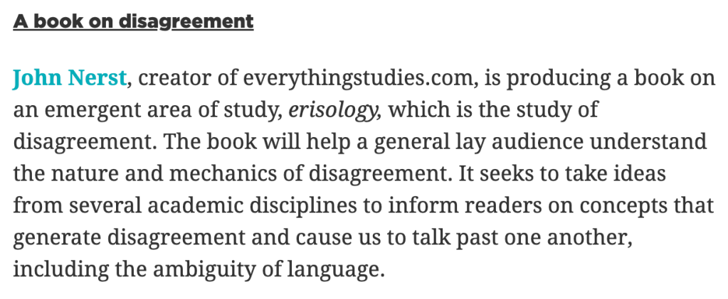What will the book be like? My working title is “Popular Erisology”. It includes the branding of the “erisology” term, but the “popular” is meant to suggest that it contains my ideal candidate for new conventional wisdom among educated nonspecialists on disagreement, rather than any original research. I’m not totally satisfied with them calling it “an emerging area of study” since I’ve moved away from that kind of language. It’ll be important to set the right expectations in the introductory chapters.