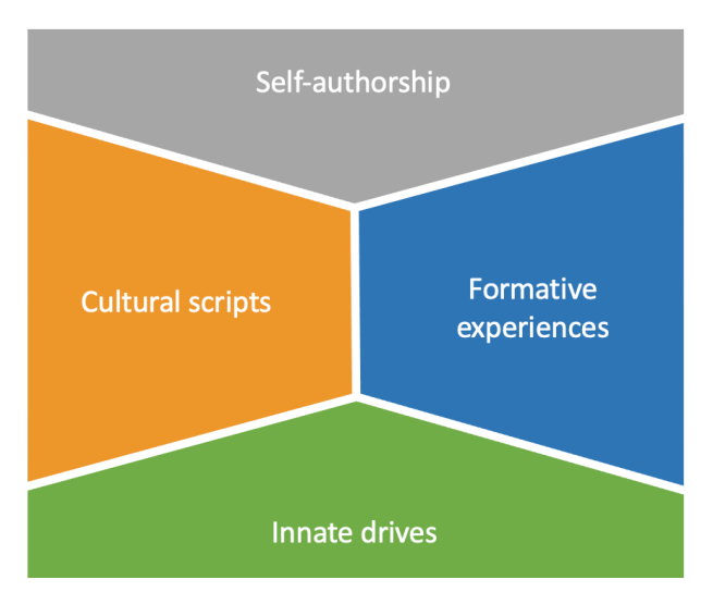 It’s useful to think of such forces as coming from different directions. Innate drives are “from below”, self-authorship is from “above”, and cultural scripts and important experiences shape us “from the sides”.